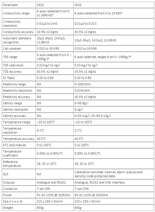 The 4520 is a high specification laboratory conductivity /resistivity/TDS/salinity and temperature meter that offers additional accuracy with 1, 2 or 3 point conductivity calibration across the wide measurement range of 0 to 19.99S. The dedicated "pure water" mode ensures the optimum accuracy for this difficult application.