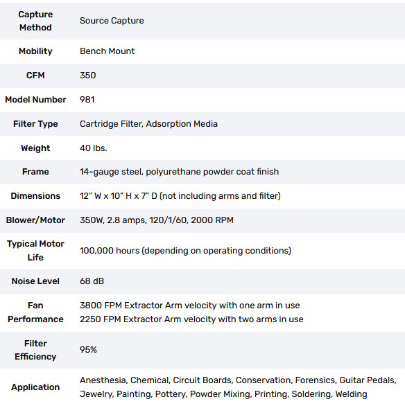 The BT981-2 Bench-Top Air Cleaner is great for the capture and filtration of airborne contaminants with an emphasis on chemical fume removal. Its compact design, dual-arm capture capability, and efficient filter system—featuring a chemical-absorbing activated carbon blend—make the BT981-2 one of the most versatile air cleaners on the market.