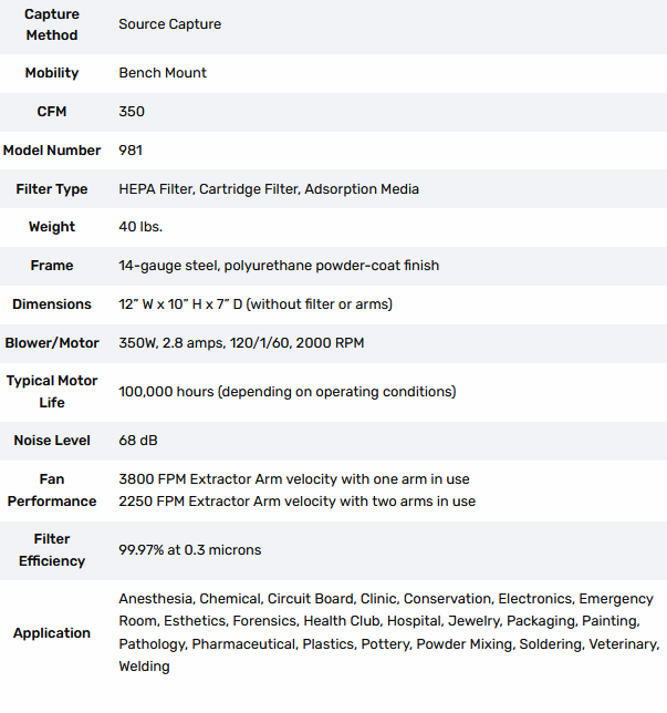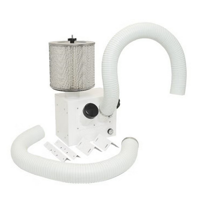 This all-in-one bench-top air cleaner comes with two sets of mounting brackets to easily attach to a table or bench, as well as two 3” diameter self-supporting extractor arms. The BT981-3 also comes standard with a 2-stage filtration system built to accommodate applications involving toxic dusts, submicron particulate removal, as well as chemical vapor control. The Activated Carbon included with this system is capable of adsorbing up to 50% of its own weight of certain VOCs.