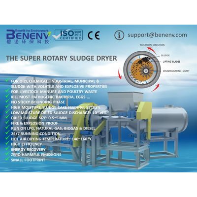 The super sludge dryer is equipped with a unique crushing and stirring device in the drying cylinder, and the rotatable cylinder itself also has the function of crushing and stirring The pulverizing and stirring device can pulverize and disperse materials such as sticky and lumps, so as to increase the hot air contact efficiency, and the cylinder body can ensure that the dry product with uniform quality (particle size is 0.5-5 mm) can be obtained in a short time. It can be used for dewatered sludge, pharmaceutical sludge, chemical sludge, heavy metal sludge and other sludge with high viscosity. Direct contact dryers cannot be used for oily sludge with oil content >2% and sludge with volatile and explosive properties. Indirect super sludge dryers can be used for such sludge.Advantages:
