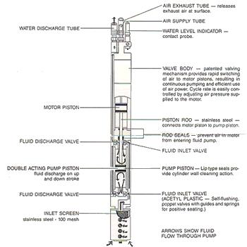 Bennett Sample Pumps have automatic reciprocating piston motors, operated by compressed air, that generate power for operating a double acting, piston fluid pump. Models for lifts up to 500 feet have one motor piston; Models for lifts up to 1000 feet have two motor pistons, providing increased power for operating the pump. All models have a differential ratio between the motor pistons and the pump to accomplish lifts using low pressure air from small compressors.