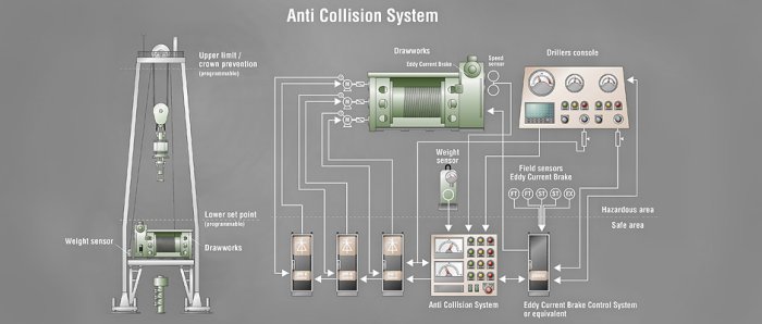 The Bentec Anti Collision System protects the mast and drilling equipment in the center line from collisions and damage when operating the traveling equipment. The system continuously monitors all of the traveling equipment’s movements in the mast. Safety is achieved by controlling the position of the traveling equipment with precisely predictable stops in any position within the safety zone. This provides a high level of protection to prevent personnel injury and damage to the mast or drill floor equipment. Any differences in calculations made by two independent control systems immediately initiate emergency braking in case of a system failure.