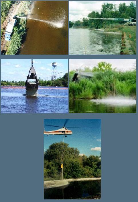 - Stone Slinger (radial conveyor mounted on the back of a modified dump truck) - can accurately place material to distance of ~90`; ideal for application through standing water