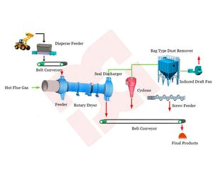 The complete bentonite drying system is mainly composed of hot air stove, belt feeder, dispersing device, rotary drum dryer, belt discharger, induced draft fan, cyclone dust remover, bag type dust remover (or wet dust remover) and operation control system.