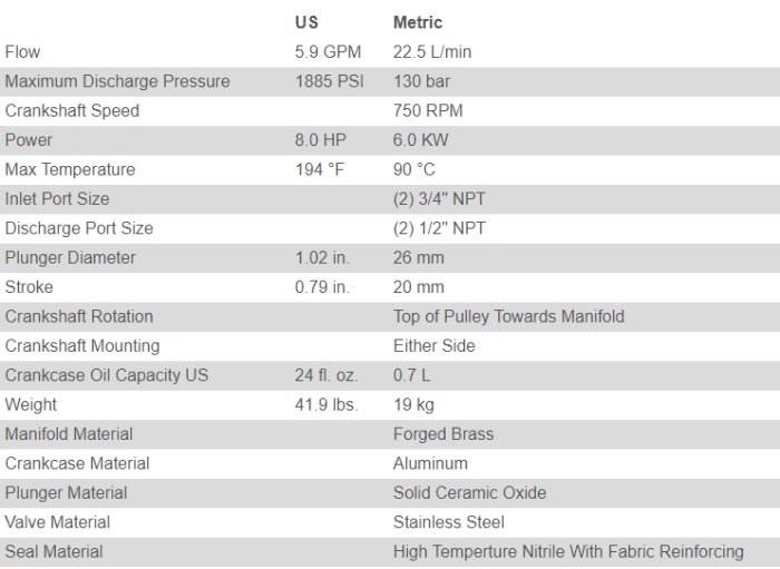 Aluminum crankcase with sight glass and vented dipstick; forged, through-hardened, ground and polished crankshaft; bronze connecting rods; hardened stainless steel plunger bases; solid ceramic plungers; special seals (with fabric reinforcing); stainless steel valves and forged brass manifold.