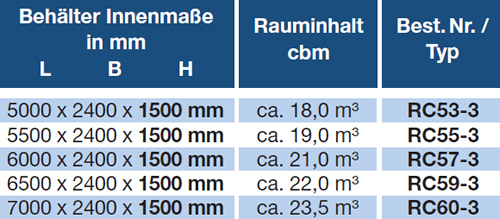 Height 1500 mm. Manufactured according to DIN 30 722. Two convex side panels. Bottom made of wear-resistant steel 450 HBW (4 mm). Sidewalls, front and doors made of wear-resistant steel 450 HBW (3 mm). Hook ø 60 mm. Sub frame made of IPN 180. Additional fiber belt made of wear-resistant steel 450 HBW (3 mm). Top frame made of special pipe 125/95/8 (S 355). Rollers with grease nipples ø 160 mm. Set of net hooks welded all around. Ladder at front side. Additional lock for safety door opening according to accident prevention regulations,. Primed and coated in RAL colour of your choice.