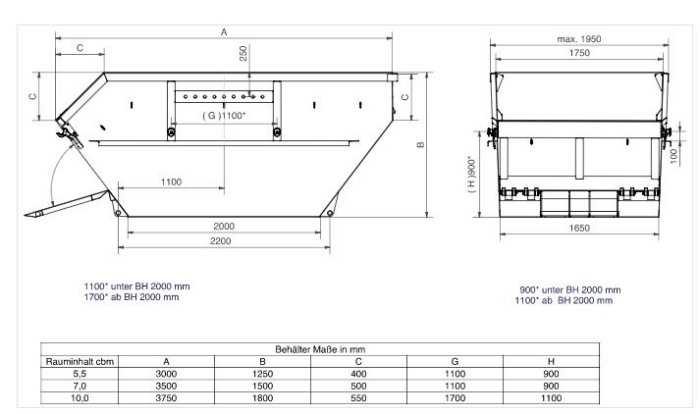 Height: 750 – 1250 mm. Manufactured according to DIN 30 722. Convex side panels. Bottom (4 mm), sidewalls, front and doors (3 mm) made of S 460 MC. Hook ø 60 mm. Sub frame made of IPN 180. Double twin door with middle lock. Rollers with grease nipples ø 160 mm. Set of net hooks welded all around. Ladder at front side (optional). Additional lock for safety door opening according to accident prevention regulations. Primed and coated in RAL colour of your choice.