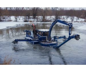 Thanks to its long working arm (7.50 m long), it can reach almost any water bottom effortlessly. Up to 9 implements can be used to meet all requirements, whether desludging, dredging, mowing, collecting or demolition work.