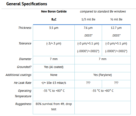 B4C windows have been designed to provide transmissions comparable to standard ? mil and ½ mil Be windows. The initial product release utilizes a uniform 3.5 µm thick B4C layer, self-supported, without the need for an underlying grid. An aluminum outer coating provides a grounded surface to help shield the detector from EMI.