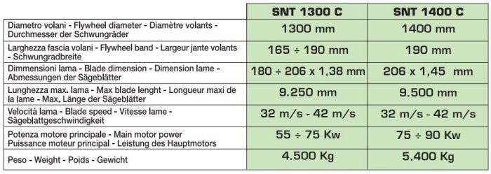 Bladeguide with real time blade deviation corrector (Patented device). Driven chain belt for cants unloading. Clean-cutting device with circular blade AP 160. Quality cast iron column and base - Spheroidal cast iron flywheels designed for high speed, assembled on high dimensioned shafts, in special hardened and tempered steel, rotating on self-aligning roller bearings -The band blade is strictly hydraulically tensioned; the rigidity is further increased by the lower and upper blade guide with "constant pressure" hydraulic blade tensioning device. Lateral hydraulic blade deviation - Upper blade guide hydraulic vertical positioning - Electrical inclination of the upper flywheel - Mechanical inclination of the lower flywheel - Lower flywheel clamping through disk brake - Centralised automatic lubrication for the blade and the flywheel rings - Centralised forced pumping oil lubrication for the sliding parts - Pneumatic automatic safety device.