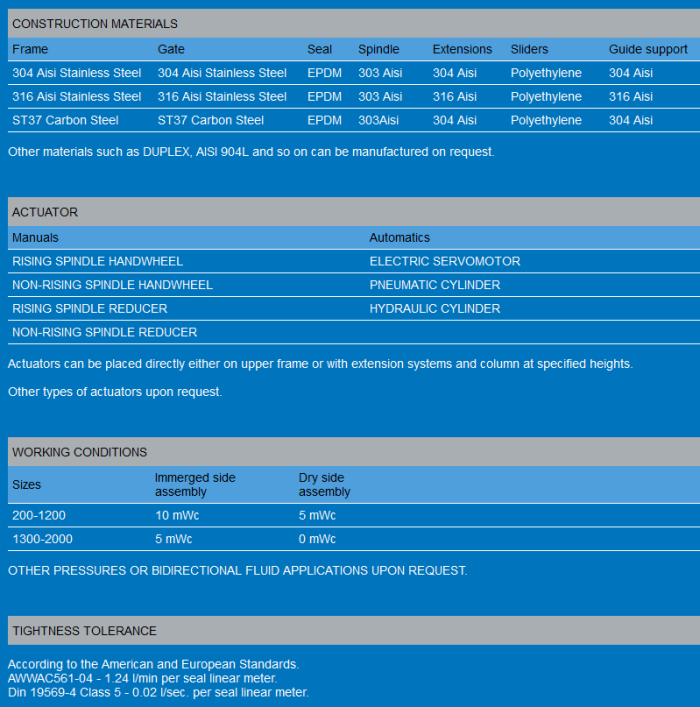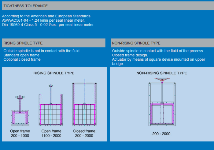 Fabricated square or rectangular port wall penstock sealed on all 4 sides, modulate design so that the frame can be used for on-off. Available in different construction materials, with elastic profile sealing and a guided system by means of sliders to reduce rate of friction. Standard manufacture dimensions from 200 x 200 up to 2000 x 2000 mm. Other dimensions upon request. Sealed on all 4 sides to be wall-mounted in order to control the flow.
