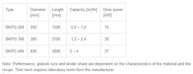 Compared to disc granulation, lower humidity is required (less need for binder), higher density and mechanical strength of the granules and a higher proportion of the desired fraction, up to 98%. The diameter of the granules is adjustable and is 2-12 mm. The device is also used to mix hard-tohomogenate materials.