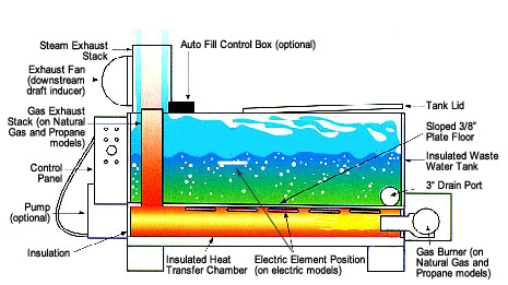 With this simple, rugged device, all the water or slops are automatically heated to boiling and turned into vapor that is then vented to atmosphere through a blower-assisted stack. Venting is easy. Water vapor is not considered a pollutant. Electric heating gives you no emissions!
