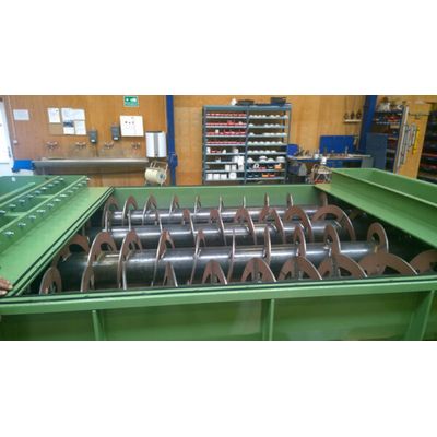 Bin for highly abrasive material: Designed for heavy duty operation. Complete closed design. Manufacturing details: House in 6 mm. Hardox-450 wear steel. Screw flights are helical to avoid bridge building around the inner tube. Chain coupling for separation of gear and screw rotor. Supplied with a customer designed system to avoid bridge building in the material. Painted according to customer specifications.
