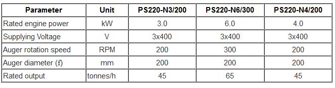 The PS220 screw auger conveyors can be installed in various ways, depending on needs and requirements. Those devices can be installed horizontally and at an angle. Regardless of the way and type of work screw auger conveyors must be mounted on a stable base, and the distance between supports fixing a conveyor pipe to the base should not exceed 4.5 meters. This kind of fixing prevents unintended movement of the conveyor, vibrations etc. In none of the devices presented in the operating manual the value of equivalent level of acoustic pressure exceeds 70 dB(A).