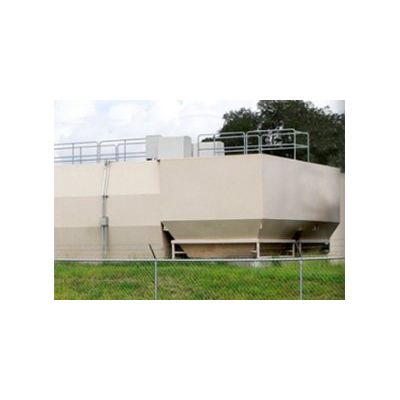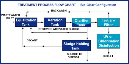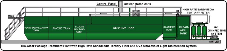 The influent wastewater enters the package plant by passing through a comminutor and bar screen for gross solids removal. This step provides for the mechanical reduction of solids prior to aeration. Once the wastewater has entered the aeration chamber, the untreated flow is mixed with an active biomass in a rolling action which takes place the length and width of the chamber in a slow forward progression. This rolling mixing action is the result of air originating from diffusers located along one side of the wall and bottom of the tank. This insures that adequate mixing is maintained in the tank. The chambers are filleted on each side and the bottom to assure and enhance the rolling motion of the water and eliminates any `dead zones` in the tank. This design feature also minimizes the accumulation of scum and froth in the aeration tank. The oxygen transfer achieved with the diffused air passing through the wastewater coupled with the rolling action provides a sufficient oxygen supply to allow microorganisms to oxidize treatable wastewater into carbon dioxide, water, and a stable sludge.