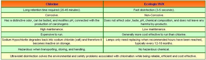 How it works....Just beyond the visible light spectrum there is a band of electromagnetic radiation which we commonly refer to as ultra-violet (UV) light. When ultraviolet radiation is absorbed by the cells of microorganisms, it damages the genetic material in such a way that the organisms are no longer able to grow or reproduce, thus ultimately killing them. This ability of UV radiation to disinfect water has been understood for almost a century, but technological difficulties and high energy costs prevented widespread use of UV systems for disinfection. Today, however, with growing concern about the safety aspects of handling chlorine and the possible health effects of chlorination by-products, UV disinfection is gaining in popularity. Technological advances are being made and a growing number of manufactures now produce UV disinfection systems for a variety water and wastewater applications. As operating experience with installed systems increases, UV disinfection is expected to become the practical alternative to the use of chlorination at many municipal water treatment plants.