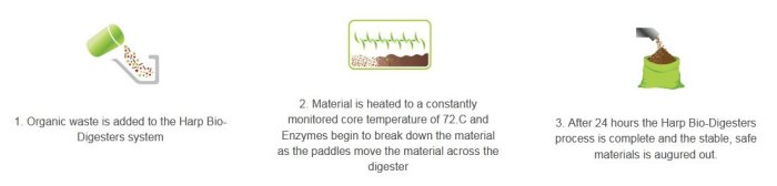 - After 24 hours the Harp Bio-digesters process is complete and the nutrient rich, safe end-product is augured out.