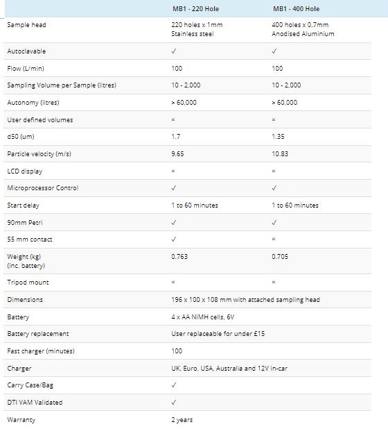 The MicroBio MB1 bioaerosol sampler is capable of using both a 90 mmPetri Dish (400 and 220 hole head versions) or 55 mm contact plates (only 220 hole head version). Using standard readily available consumables at low cost with a variety of media makes the MicroBio MB1 an economical instrument to use. The MicroBio MB1 bioaerosol sampler is an invaluable device for use in food and packaging quality assurance, indoor air quality and education