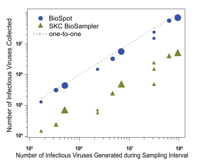 Influenza H1N1 virus (2009) - Number of infectious viruses collected as a function of the number of aerosolized infectious viruses generated (Lednicky et al. 2016).