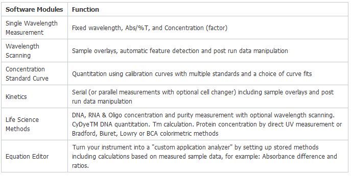 Measurement Type: Fixed Wavelength, Abs/%T, Abs ratio, Abs difference, concentration (standard curve), concentration (factor), multiwavelength, kinetics, Life Science Methods, user log-on, Equation editor