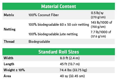 The long-term double-net Erosion Control Blanket (ECB) shall be a 100% biodegradable, machine-produced mat fabricated in the U.S.A. of coconut (coir) fiber with a functional longevity of greater than 36 months and permissible shear stress exceeding 2.25 psf.