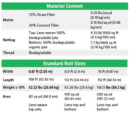 The extended-term double net erosion control blanket shall be a machine-produced mat of 70% agricultural straw and 30% coconut fiber with a functional longevity of up to 18 months. (NOTE: functional longevity may vary depending upon climatic conditions, soil, geographical location, and elevation). The blanket shall be of consistent thickness with the straw and coconut evenly distributed over the entire area of the mat. The blanket shall be covered on the top and bottom sides with a 100% biodegradable woven natural organic fiber netting.