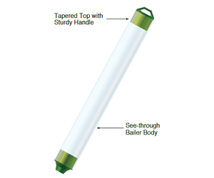 The Model 428 BioBailer™ is a low cost, biodegradable bailer made of clear PVC. The high quality design features a rigid body that will not bend. The top and bottom of the bailer are both tapered to prevent hang-ups in the well. The top has a sturdy handle for a suspension cord.