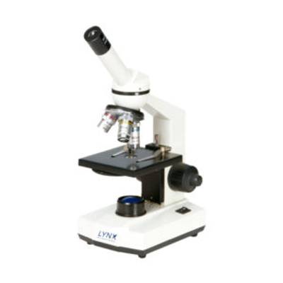 Monocular microscope with a durable metal frame and stain-resistant finish. 45° inclined and 360° rotatable head, WF10X/18 mm eyepieces, and triple revolving nosepiece with DIN 4X, 10X, and 40X achromatic objectives. 110 x 120 mm stage with clips, fine and coarse coaxial focusing, N.A. 0.65 condenser with iris diaphragm, and adjustable LED illumination. Includes AC/DC adapter, cover, fuse, blue and green filters, and carrying handle. 2-year warranty
