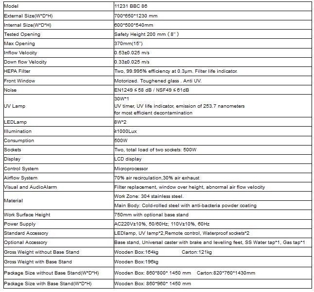 Features: Small dimension, save space. Centrifugal fan, speed adjustable; H14 HEPA filter. Motorized front window: The front window is motorized for convenient, one-hand operation. Audio and visual alarm: Abnormal airflow velocity, Filter replacement, Front window at unsafe height. Time reserve function: This can save 30 minutes waiting time after activating the cabinet and the sterilization time after experiment. Remote control: Each function can be realized 6 meters away from the cabinet by remote control, which can protect the operator under emergency. Large LCD display: Operators can check detailed status of the cabinet, such as inflow and downflow velocity, work area temperature and humidity, filter pressure, UV working time and filter working time, filter life indicator etc. With memory function in case of power-failure.