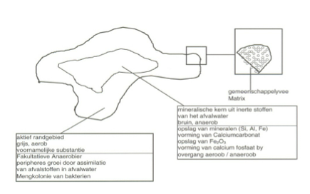 The carriers with cleaning-ability are inside the active sludge. This sludge contains numerous smaller particles with a diameter mostly between 50 & 200 µm. The center from this particle contains inactive material coming from the waste water like (1) aluminium-, iron-, and sillicium oxyde, (which gives a slight brown colour), (2) metals, (3) hydroxydes and (4) chalk. In the biological active water-sludge boarder the bacteria can be recognized by its grey colour. The content of the biological boarder-area is changing all the time. This happens because of the changing pollution in the waste water and because of the dynamics of the particle it self which cause is unknown.