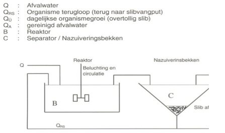 After staying in the reactor, waste water is being lead into a separator, where the flow is being reduced. Micro-organism and sludge are being held back by gravitational separation. The treated waste water (QA) is being ejected, sludge and organisms are being transported back to the reactor (QRS) or removed from the system(QÜ).