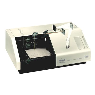 The HPTLC-Densitometer CD60 includes the know-how of more than 20 years experience and the current state of the art. A PC serves as interface between the user and the CD60 and controls all functions of the densitometer. It is equipped for absorbency and fluorescence measurements in reflectance and transmittance on objects with dimensions up to 265 x 200 x 4 mm.