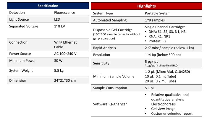 Qsep1 is a portable capillary electrophoresis system, that could be applied to any research laboratories, clinical laboratories, food farms in the fields instead of transferring the sample to the central lab and provide the precise analysis results. Qsep1 instrument is like boarding luggage size (24x 21x 30 cm) and has high flexibility in sample number (1~16 sample capacity). These compact and lightweight instruments can help researchers to turn molecular biology into "Moving Biology for Field-test". This professional portable capillary electrophoresis system has the completed software functions, including Smear, RNA auto-assign support, and with the high sensitivity cartridge (N1), this system could also analyze the diverse samples, such as cfDNA.