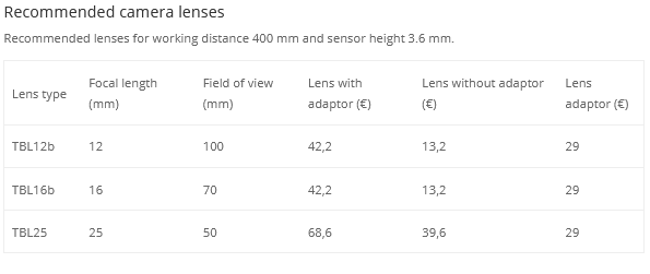 The recommended camera sensor size is 1/3” (height = 3.6 mm; width = 4.8 mm)