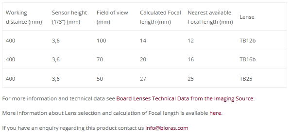 Focal length = (Working distance * Sensor height)/(Field of View + Sensor height)