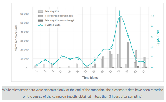 Example of a 47-day summer monitoring with the Microcystis CARLA Kit in a reservoir lake in Spain, showing accordance of microscopy and biosensors for detection of cyanobacteria.