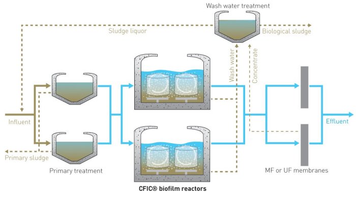 The CFIC ® process has continuous inflow to the bioreactor and intermittent cleaning, using influent wastewater, which removes excess biomass (sludge) from the biofilm carriers.
