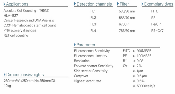 Powerful and compact. Equipped with single laser and four filters. One-button operation, intelligent analysis. Double assay platform for absolute counting. Walkaway convenience with automatedself-cleaning. Automated optical parameter setting with no need for adjustment.