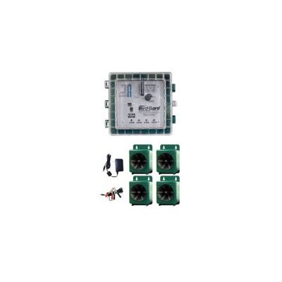 Bird Gard Super Pro features four high power amplifiers and four external speakers for crystal-clear digital output. The solid-state electronics are mounted inside a weather-resistant control box suitable for most any condition. The Bird Gard Super Pro is fully programmable, with adjustments for volume, specific sound combinations, daylight, night, or 24-hour operation. The unit includes both an AC power adapter and a battery cable (if a battery is used a 12-volt group 27 battery with at least 100 amp hours is required, but not included). Check out our Super Pro with a metal 4-Speaker Enclosure.