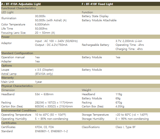 BT-410 is easy and comfortable to wear. so helps sugeries and examinations. BT-410 is easy and comfortable to wear, so helps sugeries and examinations. There is an LED indicator in eyescope of 8T-d10. so when the appropriate voltage falls below the orange light is on for charging time-Prevents the discharge of the battery and provides proper illumination to apply to the diseased part