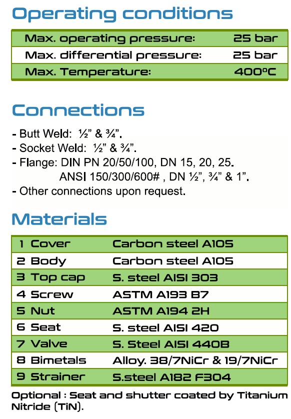 Bi-Thermostatic bimetallic steam trap, with corrosion resistant regulator unaffected by waterhammer and superheated steam. Balanced pressure valve. Independent seat and shutter, and external adjustment device while running for temperature and flow discharge. Strainer type "Y". The fact that both, valve and seat, be independent and located in the low flow discharge area, reduces erosion and extends the life of the trap. The condensate discharge is controlled by bimetallic thermostat, continuously adjusting to changes of condensate flow. Automatic air venting. Installation in any position. The independence of the valve and seat reduces dramatically the costs of its spare parts, joined to the fact that it has an external adjustment device while running, makes an extremely low maintenance cost steam trap.
