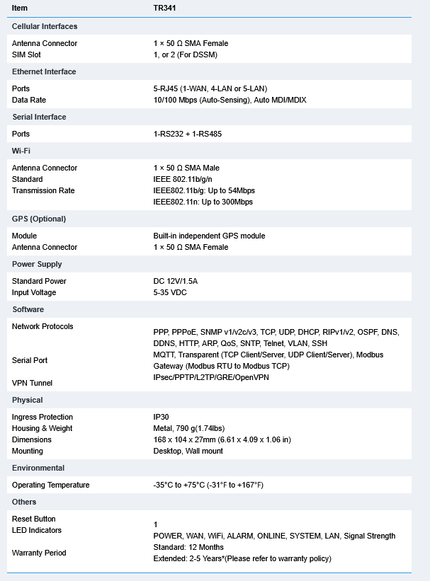 TR341 industrial router has dual SIM* for failover, which ensures you have reliable cellular network between different carriers. And the WAN port allows you auto switch between WWAN and WAN.