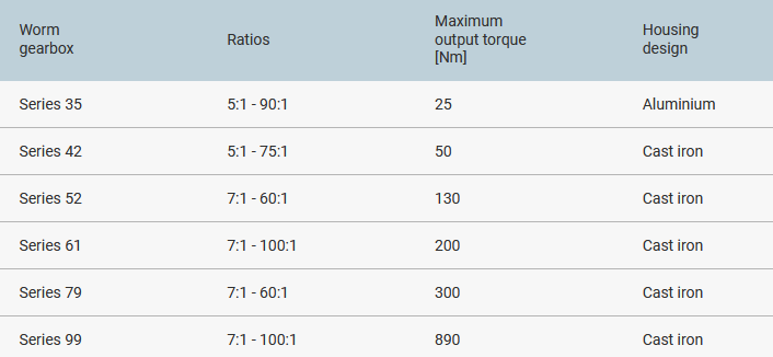 The worm gearboxes allow for reductions of up to 100:1 in one single step or 10.000:1 in a double reduction. An equivalent gearing with the same gear ratios and the same transferred power is bigger than a worm gearing. Meanwhile, the worm gearbox is in a more simple design. A double reduction may be composed of 2 standard gearboxes or as a special gearbox.