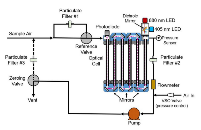 The Black Carbon Photometer is designed for the direct measurement of total extinction (absorbance + scattering) due to particulate matter at two wavelengths, 405 nm and 880 nm. The 880-nm channel can be used to compute black carbon mass concentration. Extinction at the shorter 405 nm wavelength can be related empirically to PM2.5 in a given location.
