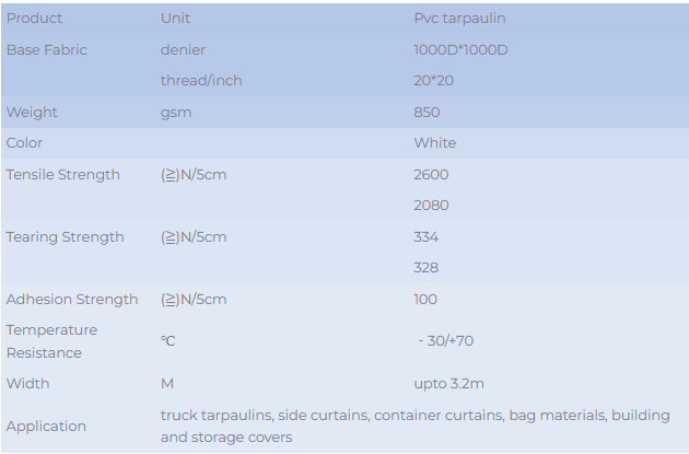 Tent material is ideal for protective covering applications. Upto 3.20m wide, the excellent weldability (high-frequency, hot air,etc), high tear-resistance, flame retardant (upon request) and resistance to ageing provides the material a long life time.
