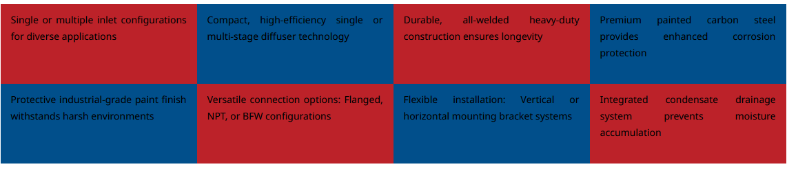 For demanding applications, we also manufacture advanced silencers with sound-absorbing casings capable of delivering Total Sound Dampening (T.S.D.) up to 60 dB(A). Most units are constructed from high-grade stainless steel for superior strength and corrosion resistance, with alternative material options available to suit specific site conditions such as extreme temperature or corrosive environments.