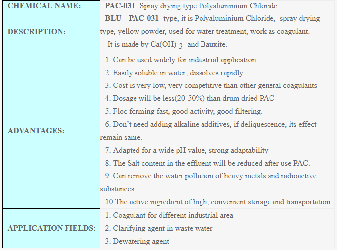 Some of its parts polyaluminium chloride, pac, pac-031,coagulant,blupac,spray type,yellow pac.