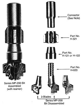The Type MP-200 bit was developed specifically for mineral exploration, coal test, foundation test and grout hole drilling. Also commonly used for drilling inside small diameter tubing in both the oil and water well industries. The MP-200 Series bits are designed for use on lightweight drilling equipment. The Rock Cutter Blades perform best in soft formations. The carbide Insert Blades are designed for use in medium-hard formations that are stronger than those drilled by the Rock Cutter type. These bits are available in the 3-blade Insert type or the 3-blade Rock Cutter type. Stocks are regularly maintained in common sizes corresponding to diamond drill specifications, with the AX size ground to 17/8` (47.6mm), BX to 211/32` (59.5mm), and the NX to 231/ 32` (75.4mm). These bits are used to drill inside standard diamond drill casing and should be ordered by the letter designation.