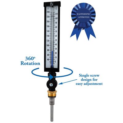 Two screws permit 180° case rotation and stem positioning in 10° increments, for easy viewing adjustment. Available in 3.5” and 6” stem lengths. Blue spirit filled thermometer set inside V-shaped aluminum scale with high-contrast black on white numeric scale for easy reading.